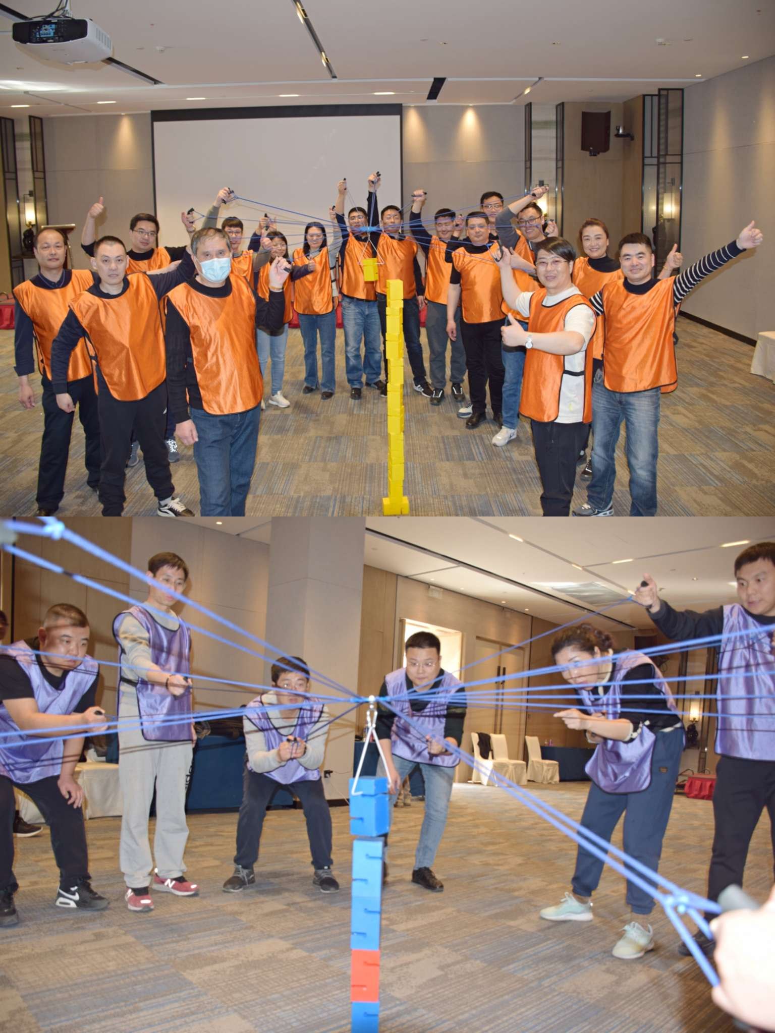 “能量传递”活动中,考验了两队的协作能力,对时间效率的控制能力,以及“补短板”的意识。