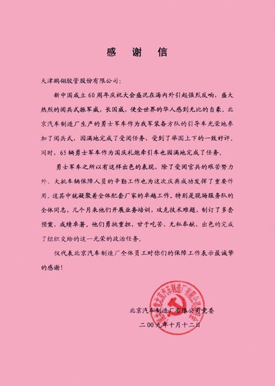 2009年10月20日,我公司收到北京汽车制造厂有限公司发来的感谢信一封,信中就金沙9001以诚为本在国庆阅兵式所用的勇士军车的整个配套保障过程中,所作出的贡献表示感谢!