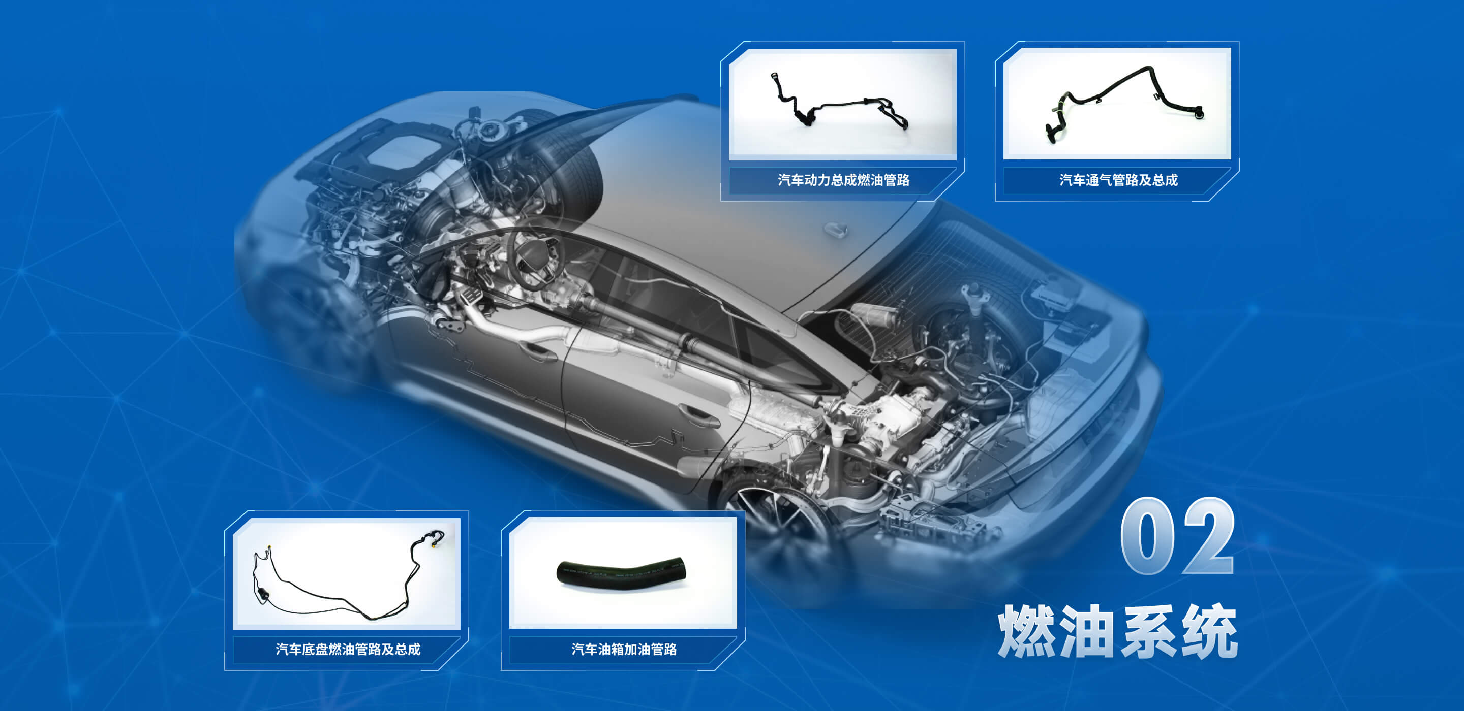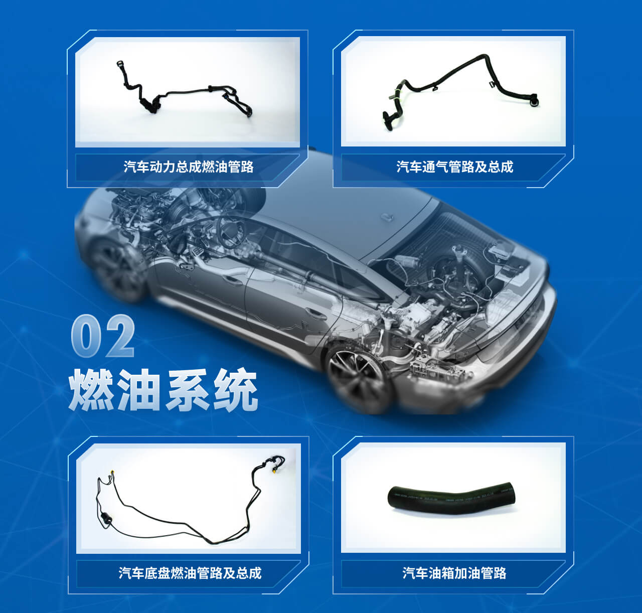 产品分类包括:动力总成燃油管路、底盘燃油管路、加油管路、通气管路。应用于汽车燃油系统,连接发动机、油泵、油箱、碳罐等主要零部件,输送燃油或燃油蒸汽,实现介质流通。