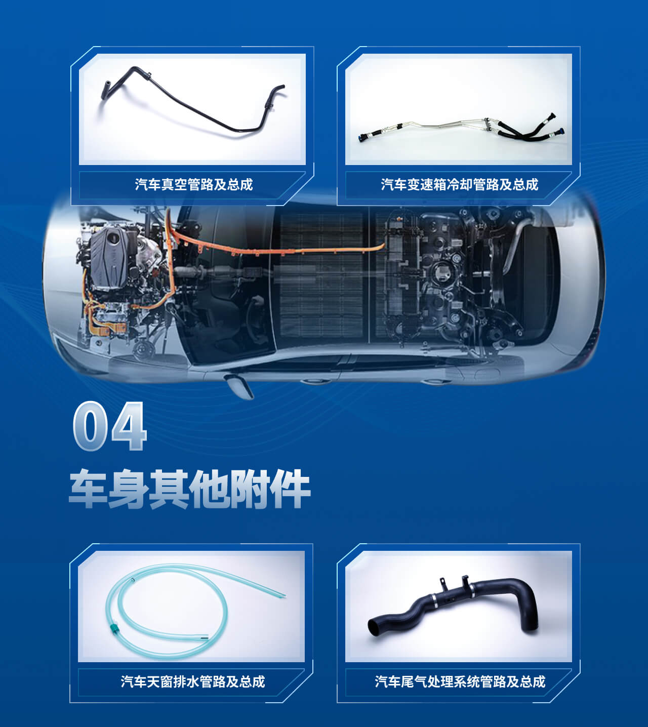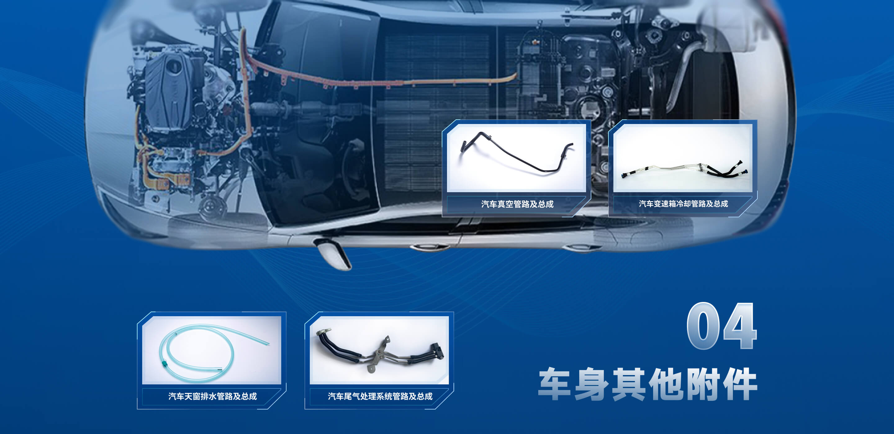 产品分类包括变速箱油冷却管路总成、天窗排水系统管路及总成、汽车真空制动管路及总成、汽车尾气处理系统管路及总成。