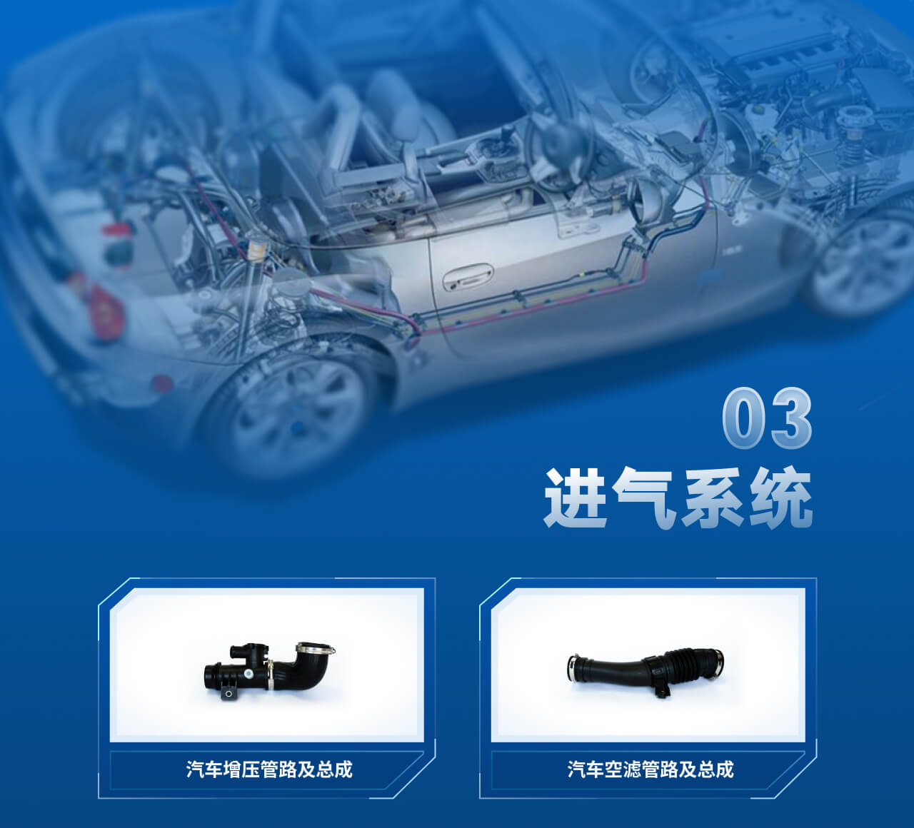 增压管路及总成,其作用在于降低增压后的高温空气温度、以降低发动机的热负荷,提高进气量,进而增加发动机的功率,材料种类丰富,覆盖了-50℃至260℃的工况,同时可以满足传统燃油车中新排放法规特殊的耐酸要求,保证管路在整车中更广的适用范围,提供整车稳定的动力运行方案;